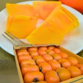 平べったく四角い形が特徴的な庄内柿。別名「平核無柿」ひらたねなしかき)と呼ばれる庄内の秋を代表する渋柿です。果肉が緻密に引き締まっており、硬いうちに食べればみずみずしくサクッとして美味、やわらかく熟すと、とろけるような果肉が味わえます。全国生産量上位に連なる人気の高い柿で、渋柿の王様と言われるのも頷けるおいしさです。こくのある甘みとジューシーな果汁。熟れた庄内柿のおいしさは、渋柿のなかでも格別です。