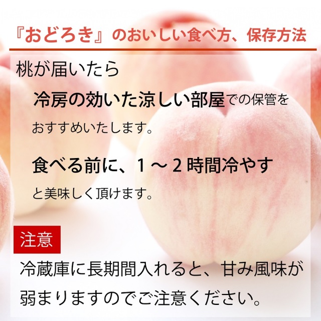 熟してもかたい桃。白鳳の枝変わりとして誕生したおどろき桃は、別名カリカリ桃と呼ばれる程かたい桃です。甘さをおさえ風味豊かで、おどろき桃ならではのサクサクとした歯ごたえが美味です。かたい桃がお好きな方におすすめです。 ※ 追熟しても柔らかくなりません。